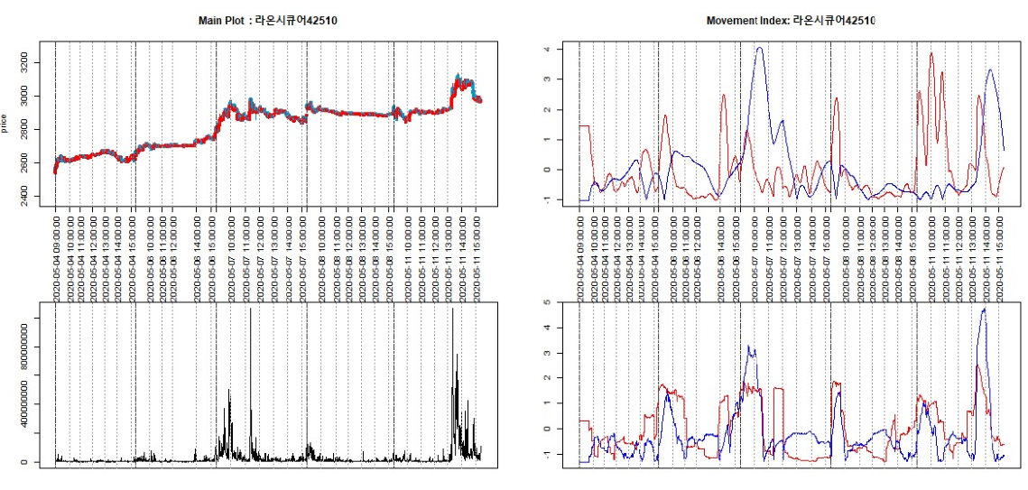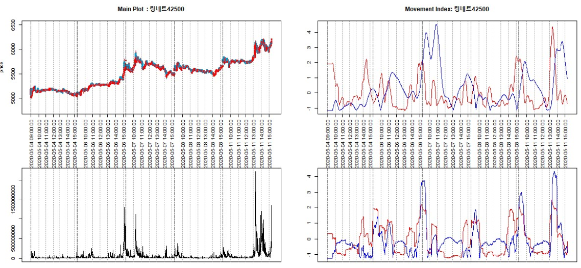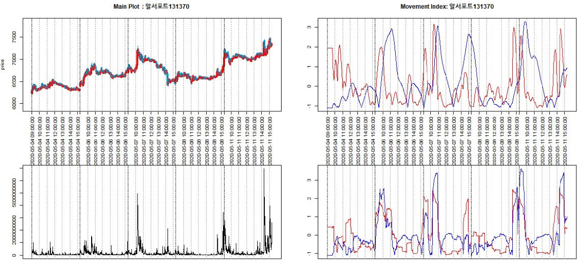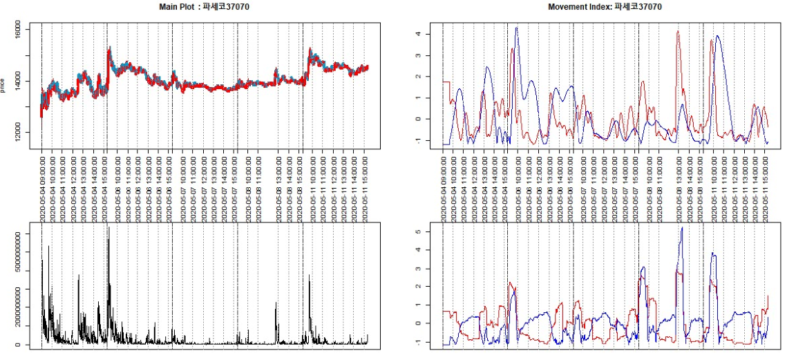 우측 Movement Index는 직접 개발한 지수로 그래프 2개 중 위는 가격에 대한 movement, 아래는 거래량에 대한 movement 이다.