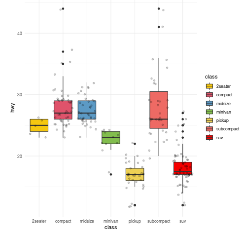 ggplot(aes(y = hwy,x = class,fill= class),data = mpg) +