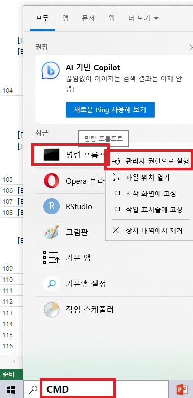 command prompt(명령 프롬프트. CMD) 를 모르시는분은 '윈도우 찾기'에서 CMD를 검색하면 위처럼 명령 프롬프트가 있습니다. 여기서 해당 아이콘을 우클릭하면 '관리자 권한으로 실행'을 확인할 수 있습니다.